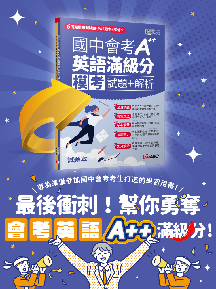 - 掃描封面QR code或至LiveABC官網下載MP3聆聽專業人士錄製的聽力題,訓練英語聽力能有效訓練聽說能力,從容應試,幫助讀者輕鬆自習和累積實力,在國中教育會考英語科的測驗拿下優異的A++滿級分!